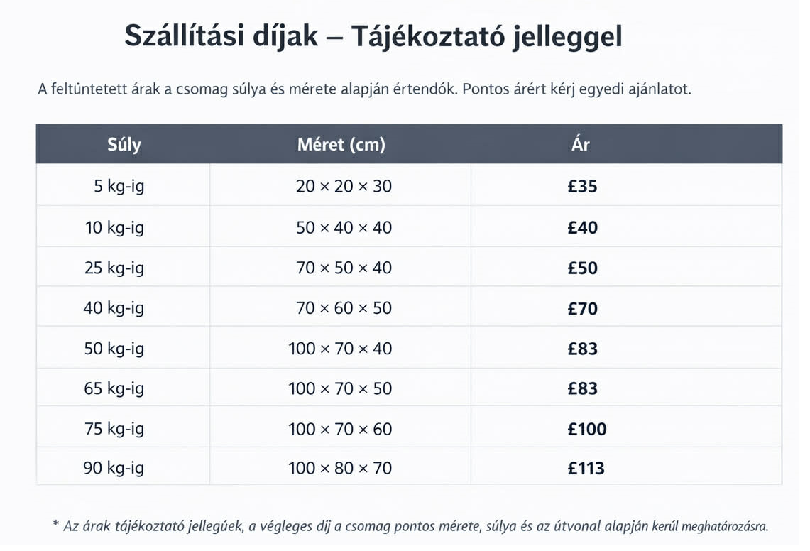 Elérhető árakon kínálunk szállítási szolgáltatást az Egyesült Királyságban élők számára és a Magyarországon lévő szeretteink, ismerőseink számára. Szolgáltatásunk kiterjed Belgium, Németország, Ausztria útba eső részeire is.